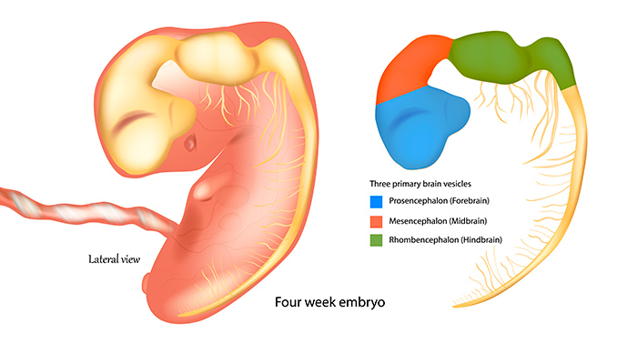 Hacia la 4ª semana (es decir, a los 28 días desde la fecundación) se produce el cierre del tubo neural, que se convertirá en la médula espinal y el cerebro del bebé.